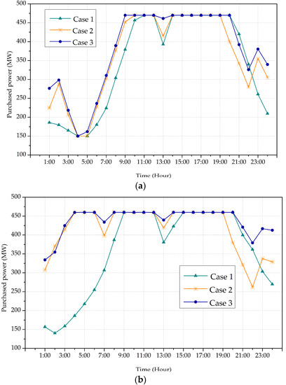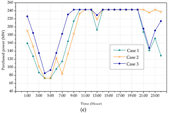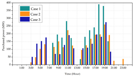 The power purchased from the spot market is shown in Figure 7. As it can be seen, in Case 1, the electricity trade between the retailer and spot market mainly occurs in the daytime. Whereas in Case 2 and Case 3, an obvious change is that the retailer purchases electricity from spot market in the night, meanwhile the purchased power during the daytime is decreased. In Case 2, the amount of electricity purchased from the spot market is decreased by 9.67%. In Case 3, the total purchased electricity from spot market achieves a further reduction from 2324.84 MWh to 2173.48 MWh. This can be partially attributed to the reduction of electricity consumption during on-peak hours. Another reason is that the customers shift part of their load to hours with lower prices. Besides, considering the uncertainty in spot prices, purchasing less electricity from spot market theoretically reduces the risk caused by price volatility.
