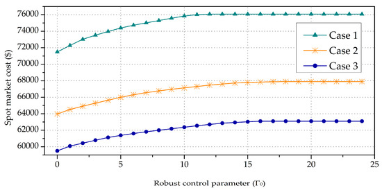As is shown in Table 7, both the revenue and cost are increased in the second and third cases. As expected, the expected profit of the retailer is significantly increased after applying TOU pricing. More specifically, compared with Case 1, the expected profit in Case 2 is increased by 10.61% and the corresponding unit profit is increased by 1.89%. Furthermore, on the basis of Case 2, the expected profit in Case 3 is increased by 5.53% and the corresponding unit profit is increased by 1.58%. The comparison above indicates that the robust model can increase the profit of the retailer through optimizing electricity purchase strategy and electricity selling prices. In the proposed robust model, the retailer uses a robust control parameter to manage economic risks in spot market. Figure 8 presents the change of the spot market cost associated with .