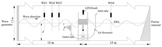 To study its hydrodynamic characteristics and air aeration efficiency, a series of experiments was conducted in a wave flume (30.0 m in length, 3.0 m width and 1.5 m height) at the Key Laboratory of Ocean Engineering, Ocean university of China. Figure 2 shows the sketch of experimental setup. At one end of the wave flume, a piston-type wave paddle was used to generate the relatively simple regular waves in order to simplify our research and a great deal of porous material for 4 m length was installed at the other end to absorb the incident wave as well as avoid the unwanted wave reflection. The device was installed at 15.0 m location after the wave generator. Four wave gauges (WGs) with a sampling frequency of 50 Hz have been calibrated well by adjusting their positions, all the measured deviations were smaller than 0.5 mm and they were installed on the longitudinal axis of the flume, where WG1, WG2 and WG3 are before the device to roughly identify the incident and reflected waves by means of reflection analysis procedure [24] and WG4 was after the device to measure the wave transmission. A well-calibrated air flowmeter (SIARGO MF5700 type) linking the inlet tube with the accuracy of 0.01 L/min was used to measure the air flow process and the vertical displacement of the heaving buoy was measured by a laser displacement transducer with the accuracy of 0.001 m after using an on-line calibration approach reported by Xie et al. [25]. Time domain analysis of the incident wave has been used for every experiment.