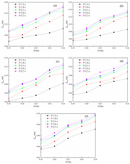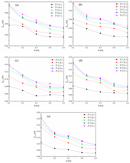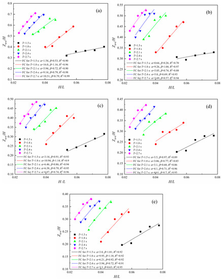 Zave/H relationship with h/H. (a) T = 1.5 s; (b) T = 1.8 s; (c) T = 2.1 s; (d) T = 2.4 s; (e) T = 2.7 s.