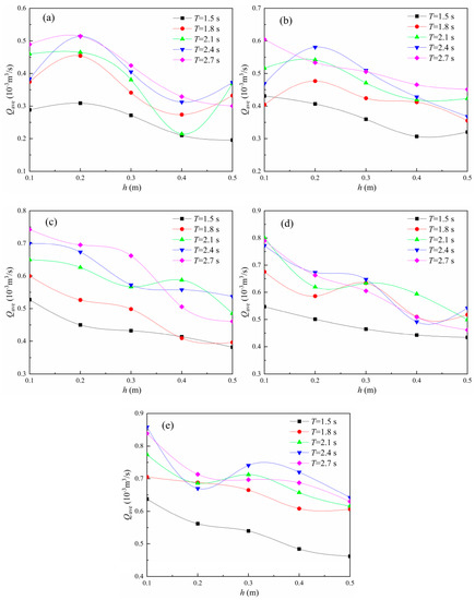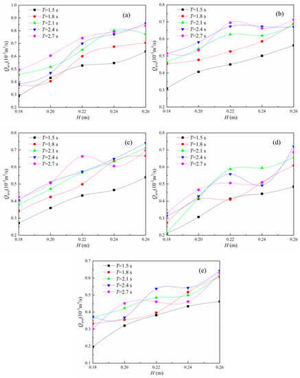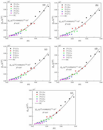 Qave/g3T5 relationship with h/H. (a) T = 1.5 s; (b) T = 1.8 s; (c) T = 2.1 s; (d) T = 2.4 s; (e) T = 2.7 s.