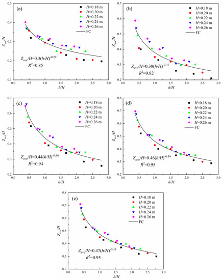 Zave relationship with h. (a) H = 0.18 m; (b) H = 0.20 m; (c) H = 0.22 m; (d) H = 0.24 m; (e) H = 0.26 m.