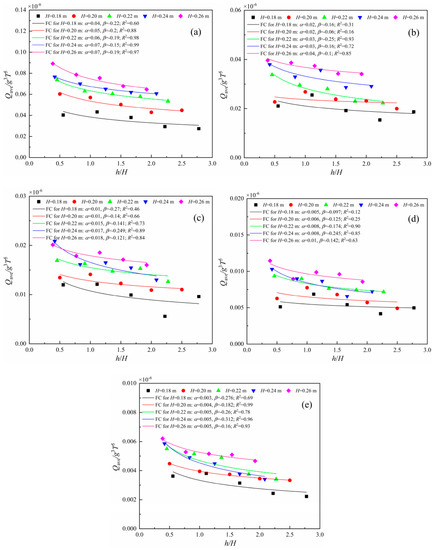 Qave relationship with h. (a) H = 0.18 m; (b) H = 0.20 m; (c) H = 0.22 m; (d) H = 0.24 m; (e) H = 0.26 m.
