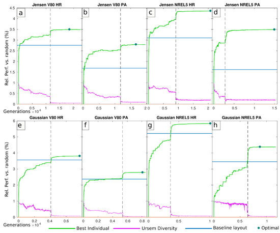 Some termination condition or conditions must be imposed to an Evolutionary Algorithm according to the performance expected or the allowed computational time. In this work, a performance condition based in the relative improvement during the last 1000 generations has been imposed. The individual which provides the highest power output at the last generation becomes the solution considered.