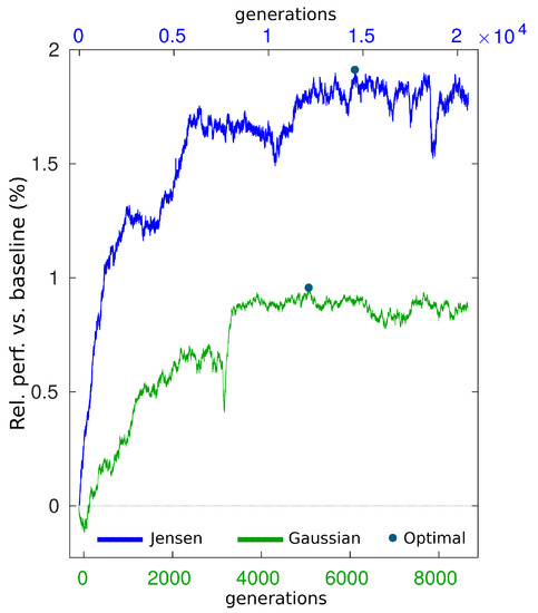 Once the cost functions has been computed for each individual of the generation, those individuals showing high performance are selected as the parents for the next generation. This selection is attained by applying a certain selection pressure to the system [70]. To be efficient, this pressure must be not too high (only very few or the best individuals are retained), in order to prevent falling into a local sub-optimum, and not too low (too many, or too low performing individuals are retained), in order for the routine to be competitive. Although the roulette wheel [71] has been traditionally implemented as a selection method, it has also shown different drawbacks related to the excessive overrating of the best solutions [72]. A rank-based roulette wheel (e.g., [73]) has shown favourable results when addressing this problem. Inspired by this strategy, we designed a selection pressure routine that relaxes the probability to be selected of the fittest solutions, by introducing some noise to the score of each individual, and associating it with the median of the scores of all individuals in the population. Thus, the final selection score is related to the performance of the rest of the population during generation G as follows: