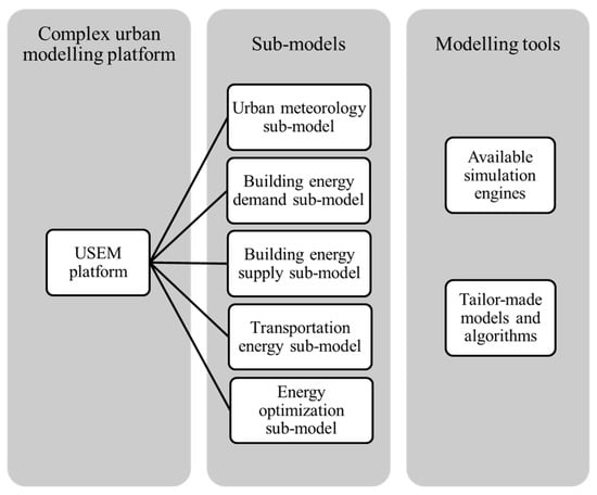 Cities have proved to be one of the largest energy consumer groups and emitters of greenhouse gases in the world []. Consequently, urban areas offer a large potential for energy efficiency improvement and greenhouse gases mitigation. One of the key aspects to evolve towards a more sustainable city energy system is to develop integrated or multi-energy systems, where electricity, heating, cooling, and transport interact with each other at various levels. This new urban energy paradigm presents challenges and uncertainty of systems interaction. In order to assess the behavior of urban energy systems, the research field of multi-domain Urban-Scale Energy Modelling (USEM) has experienced a considerable progress in the recent years. USEM platforms are being developed and used as means of anticipating the resulting performance of different scenarios and/or finding the optimal scenario according to given criteria. In fact, USEM comprises a great variety of analysis areas, thus USEM platforms (i.e., simulation programs able to model urban-scale energy systems) actually represent an assemblage of different particular sub-models, as depicted in Figure 1. A sub-model in this context is defined as a model developed specifically to reproduce the behavior of a sub-system within the urban context, aiming at estimating the performance of a simpler system compared to the more complex overall urban-scale energy system.