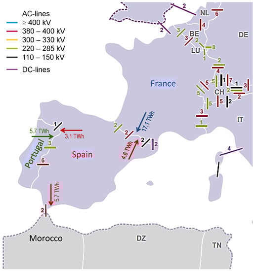 The Spanish continental electricity system is interconnected with the corresponding systems of France, Andorra, Portugal, and Morocco, as can be seen in Figure 1, adapted from [25]. This figure shows the number of circuits and their corresponding rated voltages on cross-border transmission lines (as of 31 December 2017) in the southwestern ENTSO-E area, as well as the annual energy exchange for 2017 [26].