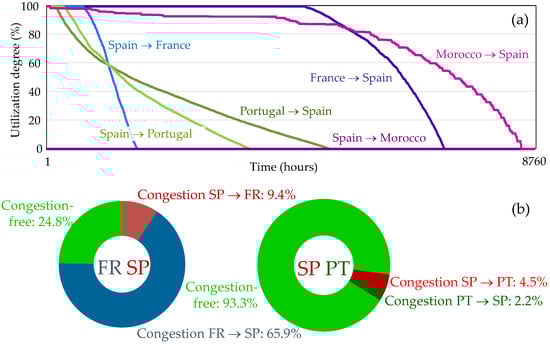 (a) Hourly load duration curves of the degrees of utilization of the commercial interchange capacities of the Spanish cross-border interconnections and (b) annual percentage of days with and without congestion in the interconnections France-Spain and Spain-Portugal in 2017.