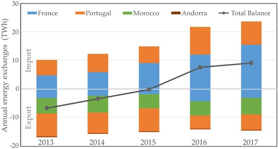 As can be observed, in 2017, the electricity exchange of Spain with the interconnected countries had a net import balance for the second consecutive year, and presents a clearly growing trend over the last 3-year period of about 4.52 TWh/year (over the 4.29 TWh/year of average rate for the five-year period 2013–2017). The greater bidirectional exchanges take place with France and Portugal. The net exchange balance with France and Portugal are both positive (import). Conversely, the Moroccan system always imports energy from Spain, as does that of Andorra, although the exchange with Andorra is relatively small (less than 0.3 TWh/year) and has therefore been disregarded in this work.