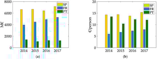 2014–2017. (a) Annual amount of premiums to renewable-energy production for Spain (SP), France (FR), and Portugal (PT); (b) yearly renewable-energy premiums per capita.