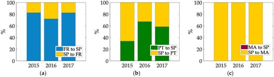 2015–2017. (a) Annual percentages of international SP-FR energy exchanges; (b) annual percentages of international SP-PT energy exchanges; (c) annual percentages of international SP-MA energy exchanges.