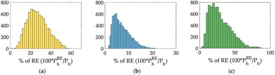 Figure 6 shows the histograms of the hourly percentage of renewable penetration in Spain (a), France (b), and Portugal (c), for 2017. The renewable penetration has been calculated as the ratio of hourly renewable generation divided by the total hourly generation: . Very similar hourly histograms of renewable production have been obtained for the years 2015 and 2016.