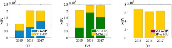 Considering that the hourly percentage of renewables exchanged are the same as those of renewable penetration in the exporting country, the amount of hourly renewables exchanged, , has been calculated following Equation (1). The annual amount of renewable exchanged between two counties, , has been calculated as the sum of the hourly exchanges for the 8760 h of the year, according to (2), and this has been represented in Figure 7 for: (a) Spain-France; (b) Spain-Portugal; and (c) Spain-Morocco.