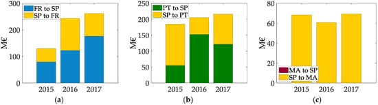 2015–2017. Annual amounts of renewable premiums (M€) ‘transferred’ (exported) through international exchanges: (a) between SP and FR; (b) between SP and PT; (c) between SP and MA.