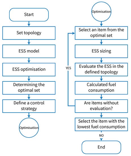 In this paper, a new methodology is proposed for the optimal sizing of the energy storage system in order to reduce the consumption of the , as shown in Figure 2. It is based on the application of a multi-objective genetic algorithm with experimental data of real routes.