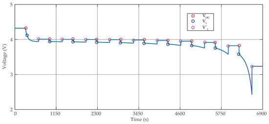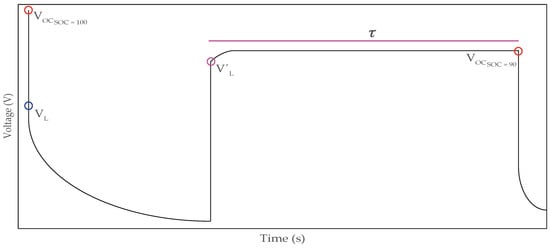 The behaviour of the cell can be estimated by experimental measuring of the based on 1C discharge rate beginning at 100 % of . A 1C rate means that the discharge current will discharge the entire battery in one hour. As shown in Figure 4, is the voltage of the cell when the load is connected with the constant current and is the voltage when the load is disconnected.