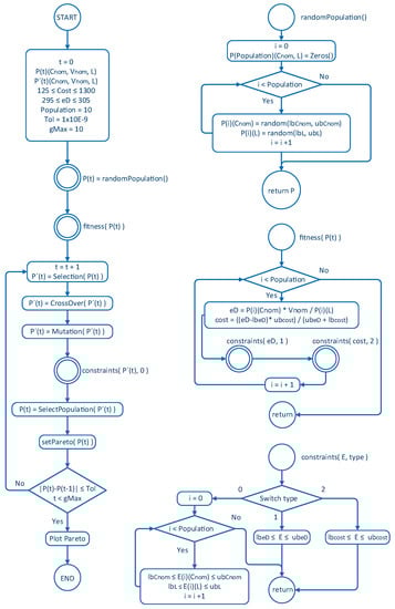 A multi-objective genetic algorithm is used, as shown in Figure 5, with the purpose to find a finite space of local optimal solutions (S) in a limited interval of time. Each element in the optimal solution space defines the characteristics of a cell (22), taking into account the constraints (18):