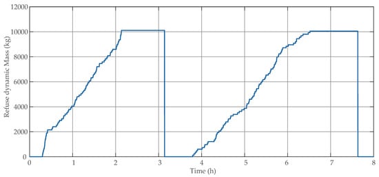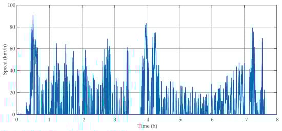 To validate the proposed methodology, in this work, a real drive cycle from an Iveco Stralis GNC 270 (The vehicle is driven from Tarrega to La Faneca, both in the NE of Spain) is used, as shown in Figure 6. To obtain a real drive cycle, a datalogger CANalyzer CANCase XL (Vector Informatik GmbH, Stuttgart, Germany) with two CAN ports (SN 007130-011289) is used, allowing the storage of torque and rpms of the . These parameters are obtained from the , through the communication bus (CAN J1939) of an during an 8-hour workday. The parameters of this are displayed in Table 2. Based on the maximum collection weight, a dynamic weight profile is proposed, as shown in Figure 7, which distributes the maximum weight during traction moments of drive cycle.