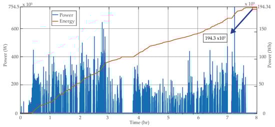 Using the quasi-static model described in Section 2, the power and the energy of RCV in a real route is determined, as shown in Figure 8.