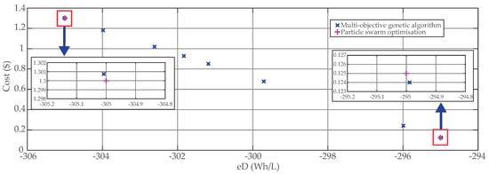 Optimal solution space with the multi-objective genetic algorithm and the particle swarm optimisation for the optimisation problem.