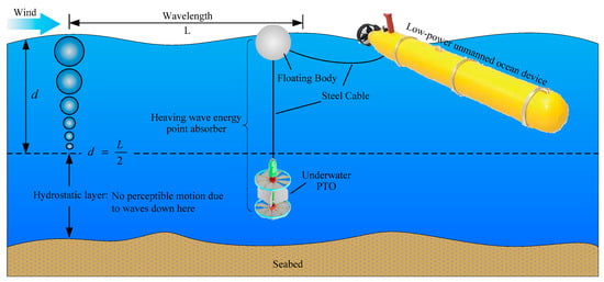 The waves are generally generated by wind blowing across the surface of the ocean. The motion of waves is regular and periodic on the water surface, with the amplitude decreasing exponentially with depth. When the depth to be greater than half the wavelength, the wave-induced motions is only approximately 4% of those at the surface and thus could be considered to be insignificant [10]. Therefore, this depth range is defined as the hydrostatic layer, in which the motion of waves is hardly perceived as the depth increases. Based on the above characteristics of wave motions, a novel heaving wave energy point absorber is designed, which can be used as a power module for the low-power unmanned ocean device [7]. Figure 1 shows the working scene of this point absorber. First, when the low-power unmanned ocean device is working on the ocean surface, the value of the battery energy is decreasing from the maximum to the lowest safe. Secondly, utilizing the release mechanism of the low-power unmanned ocean device, the novel heaving point absorber is released. The Underwater PTO subsystem of this absorber converts the captured wave energy into electricity. The value of the battery energy reaches the highest energy. Finally, utilizing the recovery mechanism of the ocean device, the absorber is recovered. The above process cycles back and forth, of which ensures the energy supply of unmanned ocean device for long-range and long-term work.