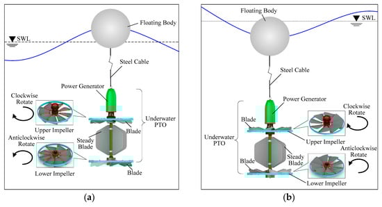 The working principle of the novel heaving point absorber is shown in Figure 2. (1) During the movement of the floating body from the wave trough to the wave crest, the Underwater PTO is pulled up by the steel cable. The upper surface of the blade is impacted by the water flow and the blade adaptively swings downward, as shown in Figure 2a. Due to the limitation of the locking devices, the blade then stops swinging and is in a slanted state after reaching the maximum angle of inclination. The water flow continues to impact the slanted blades and propel the blade forward. The circumferential array of the blades enables the impeller to be subjected to circumferential thrust. Since the blades of the upper and lower impellers are arranged in opposite directions, the upper impeller is clockwise rotated by the water flow and the lower impeller is anticlockwise rotated by the water flow, and they are relatively reversed. The upper and lower impellers are fixedly connected with the stator and rotor of the generator, respectively, and then drive the generator to generate electricity. (2) During the movement of the floating body from the wave crest to the wave trough, the Underwater PTO sinks under the influence of gravity. The lower surface of the blade is impacted by the water flow and the blade adaptively swings upward, as shown in Figure 2b. Due to the limitation of the locking devices, the blade then stops swinging and it is in a slanted state after reaching the maximum angle of inclination. Since the direction of the water flow impinging on the blade does not change, the water flow continues to impact the slanted blades and propel the blade forward. The upper impeller is continuously clockwise rotated by the water flow and the lower impeller is continuously anticlockwise rotated by the water flow. Therefore, the direction of rotation of the generator does not change and it continues to generate electricity. According to the different impact directions of water flow, the impellers’ blades adaptively adjust the blade deflection. The upper and lower impellers act as components that interact directly with the water flow and they provide continuous rotational motion to the generator during rising and sinking of the Underwater PTO.