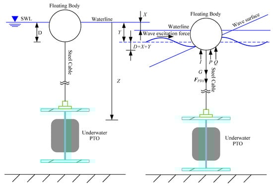We consider that the floating body of the novel heaving point absorber floats freely in water of uniform depth. Under the action of linear regular waves, the floating body does micro amplitude heave motion. The fluid is assumed inviscid and the incident flow irrotational and incompressible. Figure 3 is the coordinates and force analysis of the floating body. The right-handed inertial reference frame is centered at the hydrostatic equilibrium position of the body. is the vertical distance from the reference fluid surfaces to the body waterline (positive downwards). is the vertical distance from the reference fluid surface to the fluid surface (positive downwards). , where is the wave amplitude and is the wave angular frequency. is the vertical distance from the reference fluid surface to any point in the fluid (positive downwards). is the waterline depth of the floating body. Newton’s second law can be used to describe the system dynamics, as follows: