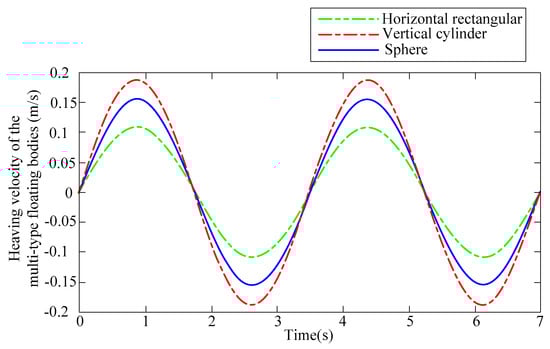 The heaving velocity of the multi-type floating bodies ( = 0.3 m, = 3.5 s).