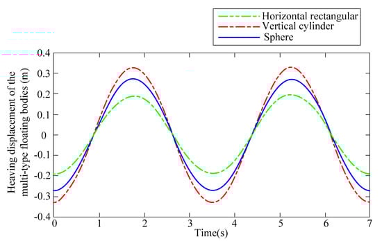 The heaving displacement of the multi-type floating bodies ( = 0.3 m, = 3.5 s).