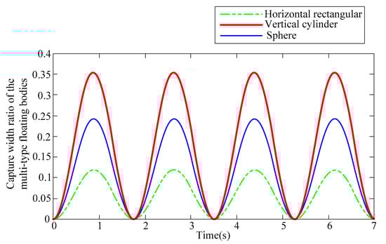 During the numerical simulation, the parameters of the multi-type floating bodies are as follows: the length of horizontal rectangular is 0.3 m, the length along the wave direction of horizontal rectangular is 0.3 m, the height of horizontal rectangular is 0.5 m, the radius of vertical cylinder is 0.3 m, the height of vertical cylinder is 0.5 m, the radius of sphere is 0.3 m, the mean immersion depth is 0.15 m, the Underwater PTO damping coefficient in the vertical direction is 20 KNs/m, and the mass of the novel heaving point absorber is 10 kg. According to the model test results of previous research [51,52,53], the diffraction correction coefficient in the vertical direction of horizontal rectangular, vertical cylinder, and sphere can be obtained, respectively.