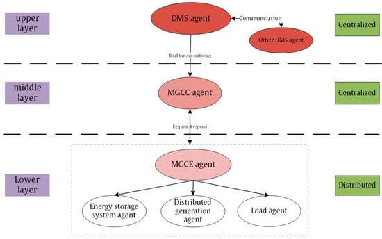 - In this paper, DG, energy storage system and power load are regarded as independent agents, whose control are determined by their own control mechanism and operation objectives. In order to efficiently and stably operate the entire MG, a hybrid three-layer MAS, including DMS agent, MGCC agent, and MGCE agent, is proposed.