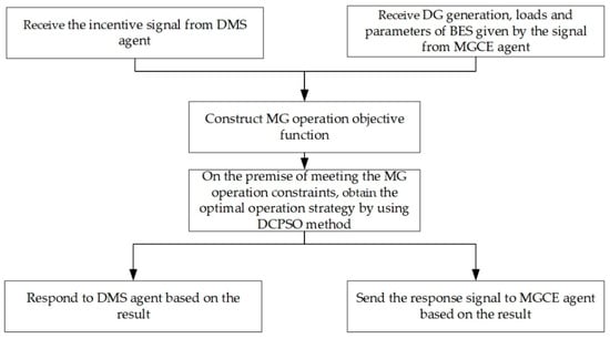 A MGCC agent mainly responds to the incentive signal of DMS agent and transfers the operation signal to MGCE agent. The specific request/respond mode is presented as follows. MGCC agent constructs its operation objective function (total cost minimization in this paper) according to the given autonomous objective from DMS agent. Based on the data such as DG generation, loads and parameters of BES given by the signal from MGCE agent, MGCC agent obtains the optimal operation strategy by using DCPSO method. On the premise of meeting the MG operation constraints, MGCC agent gives operation instructions (the optimization results) to MGCE agent and then MGCE achieves the optimal operation. The process for the MGCC layer is shown in Figure 2.