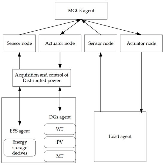 MGCC agent calculates the result of distributed power supply, the status of energy storage system and loads after DR, and sends the response signal to MGCE agent. At this point, MGCE agent will arrange all agents to respond according to the given instructions in order to reach the optimal operation of MG. MGCE agent adopts a distributed control structure, including DGs agent, energy storage system agent and load agent. All agents are equal. The DGs agent includes wind power generation agent, PV power generation agent and MT power generation agent. Energy storage system agent and load agent are mainly used to adjust the output power and meet the load demand according to response signal. The basic structure of MGCE agent is shown in Figure 3.