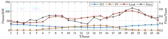 - Minimization of environmental cost (C2). The environmental cost of MG mainly takes into account the cost of CO2, SO2 and NOX emission treatment when the unit is running. Since wind and PV power generation are clean energy generation, this paper only considers the environmental cost caused by MT power generation, and the calculation is described as Equation (8):where K refers to the pollutant types (CO2, SO2 and NOX). is the unit cost of treating kth pollutant. is the emission factor of kth pollutant.