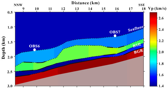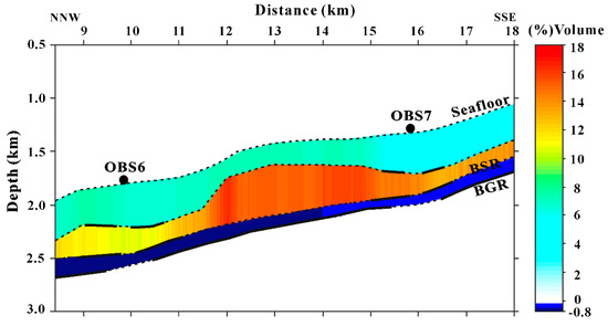 - We observe a high P-wave velocity layer of 2.0–2.1 km/s just above the BSR, which can be attributed to the presence of gas hydrates. The gas hydrate concentration in this layer is about 10% to 15% of total volume.
