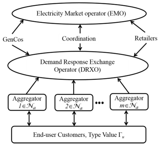 The DR integration by dynamic pricing design is investigated in [29], and an end-user’s disutility is introduced in the aggregator’s DR supply offer curve in [30]. Although a demand response exchange (DRX) is introduced, its interaction with an energy market operator (EMO) is ignored [29,31]. Authors in [32] proposed varieties of DR programs to improve day-ahead market efficiency by using a multi-attribute decision-making approach. The DR purchase and supply offers bids are managed by a DRX operator (DRXO) to create a competitive DR market environment. The DRXO clears the DR bidding and aims at minimizing the DR transaction cost. The importance of aggregator and market modelling involving multiple aggregators as an independent mediator between the users and EMO is a challenging task as recognized by researchers in [33,34,35]. Automated DR for an industry in a smart grid paradigm is an exciting research area. Considering the practical scheduling constraints of the industry in the DR program can be challenging, the widespread implementation of these programs is restricted as reported [36]. Overall, the effect of DR bidding on the wholesale electricity prices and operating expense at grid-level has been largely neglected in previous works.