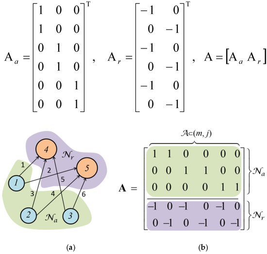 The dealings between buyers and aggregators in are denoted using the node-arc incidence matrix, A, organized of the vertical concatenation of matrix Aa and Ar. For three aggregators (Na = 3) and two buyers, (Nr = 2), the matrices, Aa and Ar, in Equation (14), take the arrangement as shown in Figure 2.