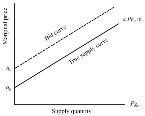 The GenCo has its own supply cost ($) curve, usually in quadratic form. Indeed, GenCo submits an hourly supply offer at the marginal price ($/MWh). The marginal price is of the form, anPgn + bn, where Pgn is the generation output of unit n, and an, bn are the cost coefficients. It is customary to submit generation blocks, q > 0, ∀q ∈{1, 2, 3, …, Q}; the seller wants to sell at a price, constitute stepwise price-generation block pair expressed by:
