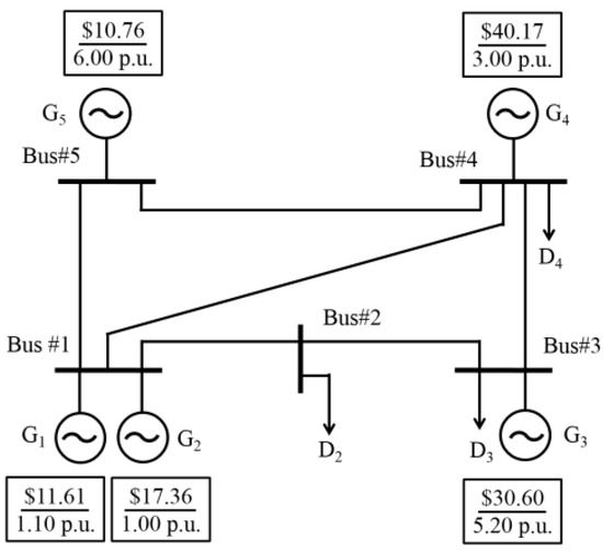 The performance of the proposed market model is investigated on a PJM 5-Bus test power system (Figure 4) consisting of three low-cost (G1 and G2 at Bus#1, G5 at Bus#5); two high-cost generation units (G3 at Bus#3, G4 at Bus#4); and the aggregated loads (D2, D3, and D4, at Bus#2, #3, and #4 respectively). The PJM is a regional electric power trading pool market that dispatches the generation and coordinates’ day-ahead capacity and real-time balancing market. It determines the LMP and the generation supply share considering bid-based pricing in a competitive manner. The LMP represents the value of the electricity at the specific location. In the day-ahead capacity market, hourly LMP is determined based on forecasted loads for each hour of the following day. The over or under-estimated loads are adjusted in the real-time balancing market. The test system data, such as generation limits [53] and transmission line parameters [47], are listed in Table 1. The offer prices for all the possible capacities are given in Table 2. The colored numbers in 7th coloumn are the marginal cost (strategic pursuit to achieve higher profit) to the G1 and G4 to deliver an additional unit of electricity at a specific location of the system. The line data, generation capacity, and load demand are at a base of 100 MVA. The upper bound of each aggregator and the DR bidding price for the users under each aggregator are provided in Table 3. The EMO collects the supply offer bid and the load demand data. Further, it settles the generation supply share and the LMP. The LMP also was known as the marginal cost to the EMO to deliver an additional unit of electricity at a specific location of a power system. The LMPs ($/MWh) are Lagrangian multipliers determined at the upper-level. The solution of the model assigns the required system load demand among the generation units in such a way that minimized the operation cost.