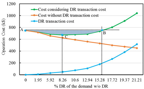 The DR compensation is given in Table 8. At the 8.26% DR level, the compensation benefit provided to the user groups are determined to be k$9.06, k$10.76, and k$9.52, respectively. The DR transaction cost at 5.92%DR is $29349. Next, at 8.26% DR, transaction cost increases to $48762. A k$19.41 increase due to 2.34% DR level. The cost increases sharply as the DR requirement rises. At 17.72% DR, the transaction cost increases almost three times than that of the cost at 8.26% DR. The higher transaction cost due to rising DR compensation offer price is neither profitable for the aggregator nor to the EMO. As seen from the DRX integrated operation curve (Figure 5), the DRX integrated market cost gradually decreases with the incremental DR level. The cost reaches a minimum of 8.26% DR. Further, it started to increase, and about 15.28% DR, the DRX integrated operation cost become equal to the cost without DRX. From the economic point of view, the DR integration level should be less than 15.28% DR.