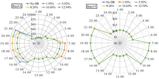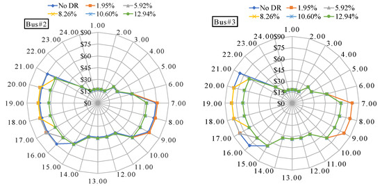 The GenCos and the aggregators are paid at the LMP rate at their respective buses. The radar charts in Figure 6 compare the hourly LMP variation for a day. The radial axis starting from the centre shows the LMP value, while the equiangular distance along the peripheries shows an hour of a day. The hourly LMP is depicted by the marker on the radial axis. The individual line colour represents the LMP with different levels of DR.