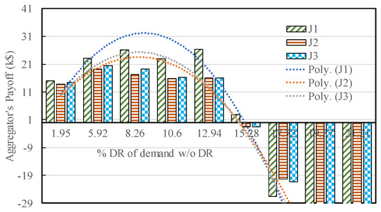 Aggregators’ Payoff: The lower-level model allows the aggregators to participate in the DR exchange in the same way that supply-side Genco’s bid into day-ahead electricity markets. The proposed DRX integrated market clearing model promotes the true market value of DR in daily scheduling intervals. Figure 7 illustrates the aggregators’ payoff with different incremental DR levels and Table 7 presents the DR amount supplied by the aggregators. The aggregator’s payoff not only depends on the amount of DR traded, but also on the LMP. The aggregator payoff is a difference of the DR selling revenue at LMP, and the compensation provided to end-users and is determined using Equation (18). Assuming, the reward scale factor, γm, as unity, with a 1.95% DR, the aggregator, A1, A2, and A3, earn k$15.15, k$13.74, and k$14.41, offering the DR amounts of 2.69, 2.66, and 2.66, respectively, in the DR trading period in a day. Irrespective of the equal DR provided by both the J2 and J3, the payoff difference happens due to different compensation price among the user group. The payoff rises and becomes maximum at the 8.26% DR level. After a 12.94% DR, a payoff reduction is observed, because of the decrease in the LMP and increase in the rate of compensation price. At the 15.28% DR level, A1 becomes marginally profitable and both A2, A3 outweigh compensation paid to the end-users than the LMP at which the A2 and A3 get paid. For any DR levels greater than 17.72%, all the aggregators lose. The polynomial fit (second order) of the payoff is also shown in the figure. As observed, with the increasing DR level, the payoff increases, reaches a maximum value, then decreases before finally becoming zero, at which point, the EMO also loses. Until such a critical DR level, the DR payoff resulting from new revenue generation driven by DRX market is considerable.