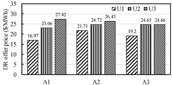DR and Compensation Share among the End-Users: In the proposed model, aggregators compensate the users for the DR that they provide. The transaction cost and compensation price are determined in DRX markets. The magnitude of possible DR transaction cost depends on how much the users can afford and the marginal disutility price. Figure 8 shows a disutility price for different user groups. Three types/groups of users under each aggregator are considered. The disutility price for user group, U1, under the aggregator, A1, is the stepper. The DR price is smallest for the U1, while it is highest for the U3. The user, U1, under the A2 has minimum disutility ($21.71), while a maximum for the group, U3 ($26.43). The offer price for the U1 under aggregator, A3, is $19.2. The price for the rest of the two group, U2 and U3, is around $24.60. The aggregator, A1, has a maximum DR supply capacity of 2 p.u. and A2 and A3 whereas having the capacity of 1.75 p.u. The end-users get paid by the aggregator at a compensation price, which is a dual multiplier associated with Equation (12) of the lower-level problem. Due to receiving compensation (payback), the users reduce the energy consumption cost. However, from the EMO perspective, the DR benefit can be obtained if the operation cost reduction at the upper-level does not outweigh the compensation given to the end-users at the lower-level. This possibly occurs when the DR demand rises significantly higher if the user seeks higher compensation. Multiplying the DR price with the allocated DR is regarded as overall DR compensation benefit for the users.