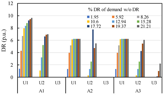 Figure 9 presents the optimal DR amount provided by the user groups for each incremental DR level. The DR transaction cost, the amount supplied, and the compensation price is found by solving the lower-level problem. Until a 10.60% DR, the user group, U2, under the aggregators do not provide any DR amount. From 10.60 to 15.28% DR; both the U1 and U2 deliver with a varying amount. At a 17.62% DR and onward, all the user group under the aggregator, A3, contribute to supply.