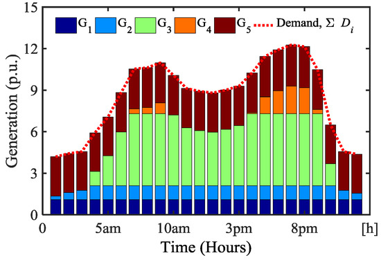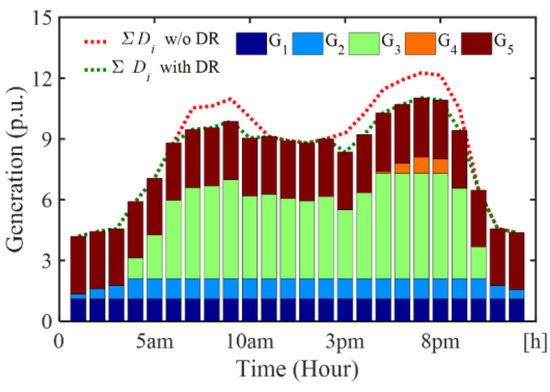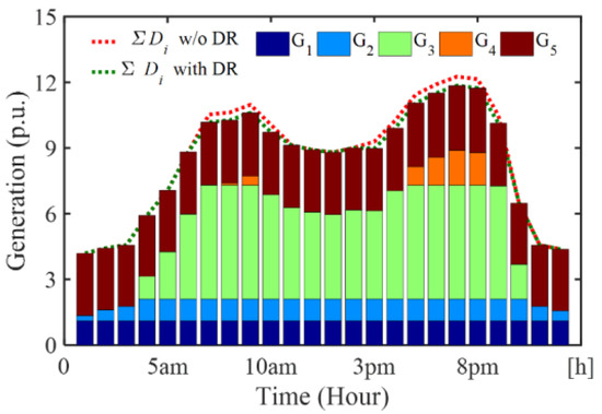 Generation DispatchShare: The solution of the upper-level economic market clearing problem finds the optimal generation dispatch. The G1, G2, and G5 bid a lower price than others. In the market clearing model, the generation units’ output is arranged according to the transmission security and economy-based merit order. Figure 10, Figure 11 and Figure 12 compare the optimal generation dispatch without and with DRX (with two different DR level), respectively. Without DRX, the generation unit, G1 and G2, are at their maximum capacity, while the G3 and G4 change within its generation limits across the scheduling hour (as in Figure 10). The amount supplied by G5 is restricted by line capacity constraint, thereby, most of the time, its output changes around 2.85 p.u. The dotted line in red colour indicates the total load demand served by all the generators.