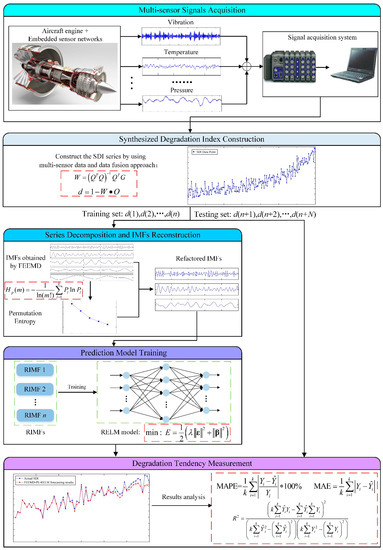 In this paper, a hybrid method using multi-sensor data based on FEEMD-PE and RELM is proposed for the degradation tendency measurement of aircraft engines. This section includes three parts: the construction of a synthesized degradation index using multi-sensor data, the reconstruction of intrinsic mode functions based on PE theory, and the general procedure of the proposed method.