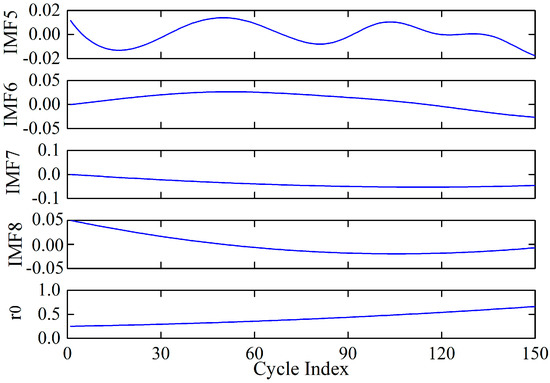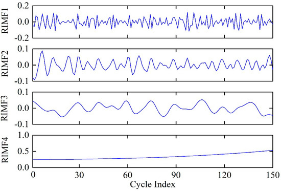 Because of the tremendous influence of IMF complexity on computation efficiency and prediction accuracy, a PE-based IMF reconstruction method was developed to establish a new RIMF system. Figure 6 presents the PE distribution of the obtained eight IMFs and one residue, and Table 3 lists the detailed PE values of these IMFs. From Figure 6, it can be found that the PE values of IMFs present a gradual decreasing trend in the decomposition process. The phenomenon indicates that the complexities of obtained IMF sequences are lowering gradually. According to the refactor principle illustrated in Section 3.2, the interval value of PE for the reconstruction of IMFs, i.e., , was set to 0.200. Based on Equation (26), the constructed RIMFs after IMF refactoring are presented in Table 4. As shown in the table, IMF3, IMF4, and IMF5 were selected to construct the RIMF3 based on the proximity of PE values. A similar principle was applied to generate other RIMFs, including RIMF1, RIMF2, and RIMF4. Figure 7 shows the obtained RIMF1 to RIMF4, which were reconstructed using the FEEMD decomposition results. It is obvious that the four RIMFs have significantly different characteristics. More specifically, RIMF1 has the highest frequency and strongest non-stationarity, while RIMF4 is almost stable across the entire lifecycle. Therefore, because of their distinct features and relatively few components, the reconstructed RIMFs can be used as the input of the prediction model to further improve the forecasting accuracy and efficiency.
