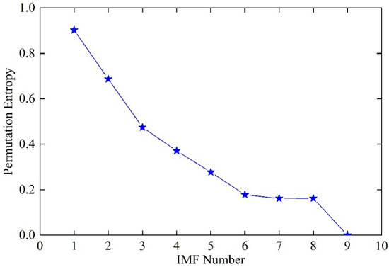 where , and , is one of the permutations. The probability for each symbol, denoted as , can be calculated, and then the PE of IMF series can be obtained as