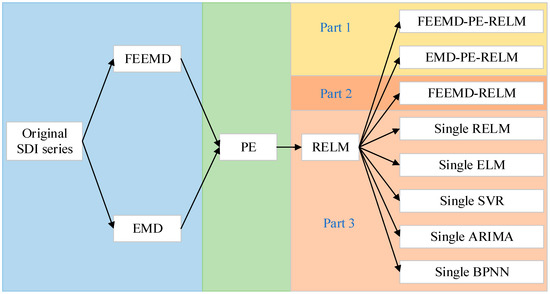 The evaluated results of the eight models are shown in Figure 10, and the detailed comparisons of the three criteria are given in Table 5. It can be concluded from the results that FEEMD-PE/RELM shows the best forecasting performance, while BPNN has the worst. The main reason is that the number of hidden layer nodes of BPNN is mainly determined by trial and error and the optimal network structure is difficult to obtain. Additionally, the performance of hybrid models is superior to that of single models, for example, the MAPEs of FEEMD-PE/RELM, EMD-PE/RELM, and FEEMD/RELM are 3.552%, 5.134%, and 9.847%, respectively, which is lower than that of RELM. This is because the decomposition by FEEMD and EMD is helpful to capture the dynamic behavior of SDI series. Moreover, the MAPE of the FEEMD-based measuring model is lower than that of the EMD-based model. The reason is that the addition of Gaussian white noise in FEEMD can effectively overcome the mode mixing problem existing in EMD. Furthermore, the MAPE, MAE, and of FEEMD-PE/RELM are superior to those of FEEMD/RELM. It illustrates that the proposed PE-based IMF reconstruction method can obviously improve the performance of the prediction model, which significantly reduces the complexity of IMFs and simplifies the input of forecasting model. Finally, compared with other single models, RELM has the most preferable performance. It inherits the great generalization ability of ELM, and, at the same time, the over-fitting of ELM is reduced due to the adoption of regularization.