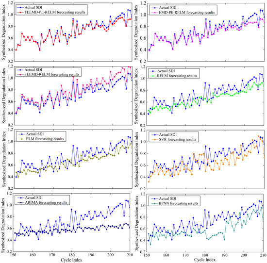 Figure 9 presents the degradation trend measuring curves of aircraft engines achieved using eight models. We can observe from the figure that (1) compared with the other seven models, the proposed FEEMD-PE/RELM method realizes the highest degree of fitting between the forecasting value and the actual SDI value, while ARIMA shows the lowest degree; (2) the hybrid models have better predicted results than the corresponding single format, which indicates that the combination of signal decomposition and trend prediction contributes to the improvement of the prediction performance of single models; (3) with the PE-based reconstruction strategy, the forecasting precision was significantly improved during the whole prediction period; (4) at some jumping points of SDI, the prediction ability of RELM is better than that of ELM, which illustrates that the sensitivity of RELM was enhanced by the regularization improvement. However, it is worth noting that the proposed method suffers the same dilemma as other methods, i.e., a higher error with the evolution of cycle index. The reason is that the number of training samples and the method of single-step prediction limit the time scale of the forecast period. This paper aims to develop a novel measurement method that can predict the degradation trend with higher accuracy compared with other existing approaches. Consequently, there is less attention focused on the time scale of the prediction period. Despite this, it can be found from Figure 9 that the proposed FEEMD-PE/RELM method still shows higher accuracy as cycle index increases compared with the other seven models.